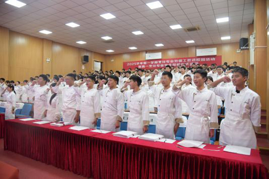 “我宣誓:擇一事、終一生,立志成為一名品德優良、技能精湛、身心健康的工匠儒廚!”在孫偉民部長的領誓下,全體新生右手握拳高舉,誓詞穿透報告廳,落在每個人的工位牌與職業裝衣襟上。從此,這頂白帽不再是簡單的服飾,而是系圍裙、握炒勺時的“初心徽章”,是踐行“命由心造,德自行為”的責任象征。