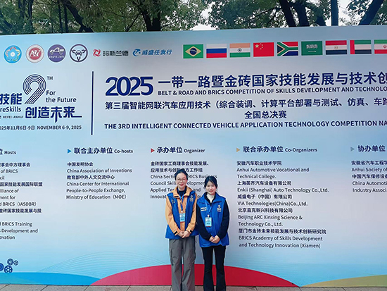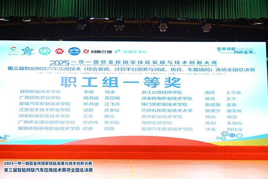 2025一帶一路暨金磚國家技能發展與技術創新大賽第三屆智能網聯汽車應用技術賽項全國總決賽于11月7日至9日在安徽汽車職業技術學院舉行。湖州交通技師學院教師團隊憑借扎實的專業功底、默契的團隊協作與出色的臨場發揮,一路過關斬將,成功斬獲職工組一等獎(金牌)。