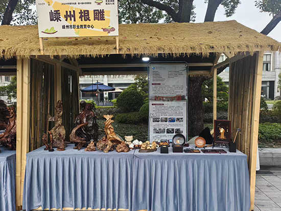 在杭州市龍塢茶鎮(zhèn)茶奧會(huì)現(xiàn)場(chǎng),組織了浙江省中職學(xué)校特色專(zhuān)業(yè)非遺教學(xué)成果展。學(xué)校選送的多件木雕作品陳列有序,備受好評(píng)。其中,姿態(tài)飄逸的人物根雕巧妙地保留了木材的天然紋理和特性,展現(xiàn)出嵊州根雕獨(dú)特的藝術(shù)價(jià)值;與之相比,學(xué)生作品“嵊小籠”顏色鮮亮,憨態(tài)可掬,以年輕人更活力、時(shí)尚的方式展示嵊州的美食文化和特色產(chǎn)業(yè),與自然古樸的傳統(tǒng)根雕相映成趣;精巧的骨木鑲嵌作品將骨片的溫潤(rùn)和木片的深沉巧妙結(jié)合,打造出柔和而雅致的藝術(shù)效果。
