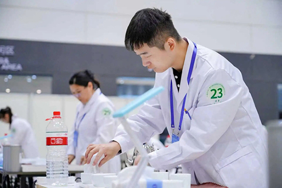 畢業后,翁致遠始終保持著對技能提升的追求,密切關注人社部門、成校組織的職業技能培訓,主動選擇感興趣的領域深耕。2022年,他報名參加評茶培訓,不僅順利考取高級評茶員證書,更在學習中加深了對茶文化的熱愛。從嘉興市賽的初露鋒芒,到省賽的層層突圍,再到站上全國賽場,他的備賽之路滿是汗水:因肢體殘疾,他在實操動作、感官判斷上需要付出更多努力,賽前60余天的集中訓練里,他研習200余種茶樣、開展300余次模擬賽事,始終繃緊“嚴謹備賽”這根弦,用反復打磨的技藝彌補差距。