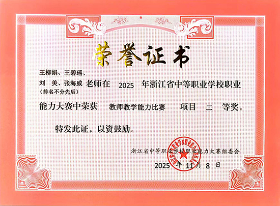 2025年浙江省中等職業(yè)學(xué)校職業(yè)能力大賽教師教學(xué)能力大賽,在浙江經(jīng)濟(jì)職業(yè)技術(shù)學(xué)院落下帷幕。云和縣中等職業(yè)技術(shù)學(xué)校由王柳娟、王碧瑤、劉美和張海威組成的數(shù)學(xué)教學(xué)團(tuán)隊(duì)榮獲浙江省二等獎(jiǎng),實(shí)現(xiàn)了麗水市公共基礎(chǔ)課的新突破!
