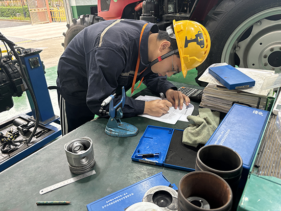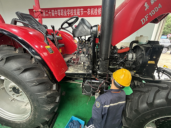 在農(nóng)機(jī)理論測試環(huán)節(jié),兩人憑借對農(nóng)機(jī)原理、故障診斷等知識的深入掌握,為后續(xù)實操環(huán)節(jié)奠定了堅實基礎(chǔ)。進(jìn)入拖拉機(jī)檢修項目,他們需在90分鐘內(nèi)完成大型輪式拖拉機(jī)懸掛農(nóng)具作業(yè)機(jī)組的技術(shù)維護(hù)、綜合故障診斷與排除,以及零件鑒定、部件及總成件檢修等內(nèi)容。面對復(fù)雜的拖拉機(jī)動力系統(tǒng)、傳動系統(tǒng)等模塊,兩人分工協(xié)作,精準(zhǔn)排查故障,高效完成維護(hù)檢修任務(wù),展現(xiàn)了對大型農(nóng)機(jī)設(shè)備的嫻熟把控能力。