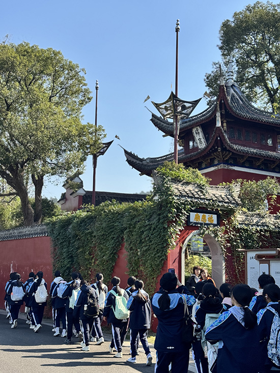 學生們列隊行至湖濱碼頭,秋日陽光灑落在南宋水利工匠鑿刻的石縫間,仿佛再現當年揮汗修堰的場景;師生沿湖探訪錢湖秘境,遠眺王安石曾踏訪的二靈寺,途經百姓為感念其治水功績而建的福應廟,步步追尋先賢足跡。