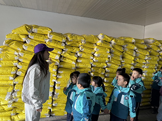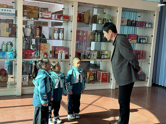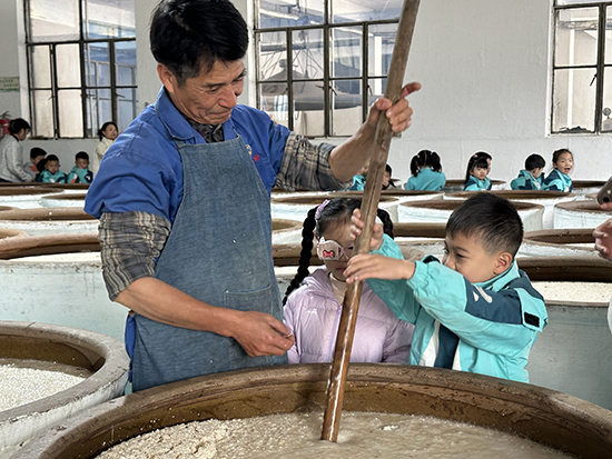 作為斬獲“浙江老字號(hào)”“浙江省食品生產(chǎn)企業(yè)衛(wèi)生等級(jí)A級(jí)單位”“紹興市食品(釀酒)行業(yè)先進(jìn)企業(yè)”“紹興市誠信企業(yè)”“諸暨市信用管理示范企業(yè)”“諸暨市納稅大戶”等多項(xiàng)榮譽(yù)的本土標(biāo)桿企業(yè),楓橋酒廠為孩子們打開了一扇了解家鄉(xiāng)產(chǎn)業(yè)的窗口。在老師的帶領(lǐng)下,孩子們徒步抵達(dá)酒廠,開啟了充滿好奇的探索之旅。走進(jìn)原料車間,整齊碼放的糯米袋吸引了大家的目光,講解員細(xì)致介紹道:“這些可不是日常食用的大米,而是端午節(jié)包粽子用的糯米,是釀酒的核心原料”,孩子們恍然大悟,當(dāng)?shù)弥茝S一年的糯米用量時(shí),紛紛發(fā)出陣陣驚嘆。發(fā)酵車間里,一排排裝滿酒釀的大缸整齊排列,孩子們圍著釀酒老師傅嘰嘰喳喳地提問,還好奇地拿起攪拌棍嘗試攪拌,切身感受到攪拌的費(fèi)力與不易,深刻體會(huì)到釀酒師傅工作的辛勞。堆壇場(chǎng)地中,高高碼放的酒壇子蔚為壯觀,孩子們紛紛在此合影留念,歡聲笑語中定格下珍貴的瞬間。包裝車間內(nèi),自動(dòng)化灌裝設(shè)備高速運(yùn)轉(zhuǎn),晶瑩剔透的酒液被精準(zhǔn)灌入酒瓶、酒壇與酒壺中,工人們熟練地完成打包裝箱工序,讓孩子們直觀感受現(xiàn)代工業(yè)的高效與規(guī)范。酒品陳列室里,造型各異的酒瓶琳瑯滿目,令孩子們目不暇接、流連忘返。活動(dòng)中,孩子們還主動(dòng)向潘正海董事長(zhǎng)發(fā)起采訪,一個(gè)個(gè)童稚又貼合實(shí)際的問題,得到了潘董事長(zhǎng)的耐心解答,互動(dòng)氛圍溫馨而熱烈。