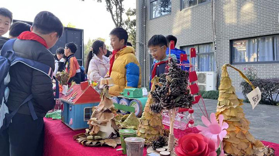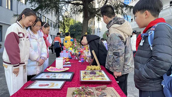 11月25日下午,諸暨市楓橋鎮洪綬小學廣場熱鬧非凡、人頭攢動。廣場四周或擺放、或懸掛著一系列充滿巧思的創意作品——落葉手工與環保手工作品琳瑯滿目,定格了秋日意趣。同學們駐足觀賞,時而對著心儀作品輕聲交流,時而在自己的作品前展露欣喜笑容,現場洋溢著濃厚的文化與實踐氛圍。