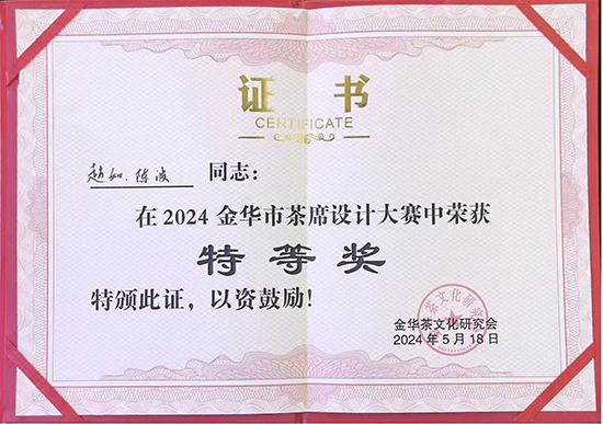 圖片說明:金華市技師學院以金華本地非遺文化為主題的作品《仙音茶韻》,在2024年金華市茶席設計大賽中獲得特等獎。該作品由學院旅游專業教師趙如、陳波設計,融合了金華黃大仙傳說、婺州舉巖茶、婺州窯、金華陶笛制作技藝等從地區、國家到世界級的本地非物質文化遺產元素,尤其是“金華陶笛制作技藝”項目是由陳波老師主導的婺城區非遺產品,并在積極申報市級非遺過程中。