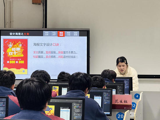 課堂上,教師團隊通過播放《林小白帶你游新昌》文旅短視頻,以AI數字人形創設真實助農情境,邀請學生組成“助農電商攻堅隊”,圍繞柿子、花生、茶葉三種家鄉農產品設計促銷海報。在文案創作環節,教師引導學生深入理解電商海報“營銷轉化”與“情感共鳴”的雙重價值,結合消費者心理精準提煉產品賣點,打造出兼具吸引力與感染力的宣傳文字;  在視覺設計環節,專業教師細致講解PS軟件中文字操作的核心技能,從字體選擇、顏色搭配到排版布局,傳授“字大抓眼,色明層級,排版整齊不費力”的實用技巧,鼓勵學生將家鄉元素與設計美學相結合。學生們分組協作、互幫互助,在規定時間內完成了一幅幅主題鮮明、創意十足的助農海報,既展現了扎實的專業技能,又深化了家鄉認同感與社會責任感。