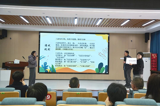 為打破交流壁壘、活躍現場氛圍,活動伊始設置“你畫我猜”趣味破冰游戲,為讀書分享環節預熱鋪墊。游戲共分3組開展,每組10道題目、限時3分鐘,采取兩人一組的協作模式,一人比劃、一人猜詞。游戲規則明確:比劃者可通過肢體動作、面部表情傳遞信息,嚴禁說出詞語中的任何一字,猜不出可喊“過”;觀眾禁止提醒,否則題目作廢。同時明確可提示范圍,涵蓋分類提示(如動物、日常用品、動作)、數量提示(如兩字、四字詞語)、特征描述(如“很大很大的”“會飛的”)及情境描述(如“廚房常用”“下雨天使用”),趣味十足的互動的讓現場歡聲笑語不斷,有效凝聚了團隊向心力。