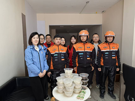 不過多久,一盤盤形態(tài)飽滿的餃子整齊排列。水沸下鍋,白胖的餃子在鍋中翻滾,逐漸變得晶瑩誘人。黨員志愿者們迅速分裝打包,將剛出鍋、還冒著熱氣的餃子細(xì)心裝盒,準(zhǔn)備送往正在奔波勞碌的“騎士”手中。