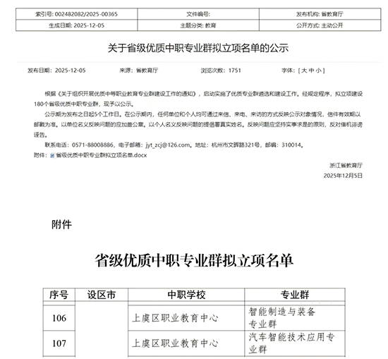 近日,浙江省教育廳正式公布省級優(yōu)質(zhì)中職專業(yè)(群)擬立項名單,上虞區(qū)職業(yè)教育中心“汽車智能應用技術”“智能制造與裝備”兩大專業(yè)群成功入選。這是學校繼高質(zhì)量完成省中職名校、省高水平專業(yè)建設后的又一重要突破,標志著學校開啟新一輪專業(yè)群建設新征程,這不僅為“十五五”期間學校高質(zhì)量發(fā)展開好局、起好勢筑牢根基,更是彰顯了學校在專業(yè)群內(nèi)涵建設、高素質(zhì)技能型人才培養(yǎng)領域的扎實功底與顯著成效。