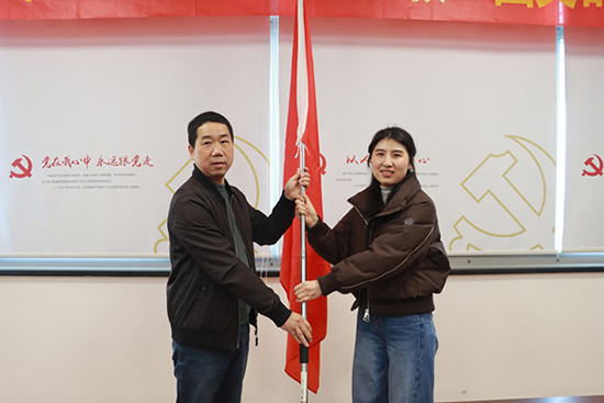 校黨總支書記張昌森向新成立的“1358”團(tuán)支部負(fù)責(zé)人宿瑋涵授予了支部旗幟,象征著責(zé)任與使命的傳遞。