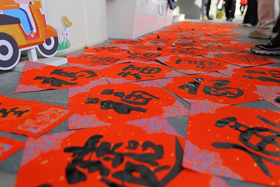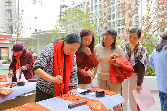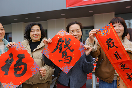 紅紙鋪展,墨韻飄香。一幅幅筆力遒勁的“福”字躍然紙上,“國富民強(qiáng)萬物盛 人和家興百業(yè)昌”“和順一門添百福 平安二字值千金”“一帆風(fēng)順全家福 萬事如意滿門春”等寓意吉祥的春聯(lián),被聞?dòng)嵍鴣淼娜罕姞?zhēng)相領(lǐng)取,大家手捧墨寶,臉上洋溢著幸福的笑容。