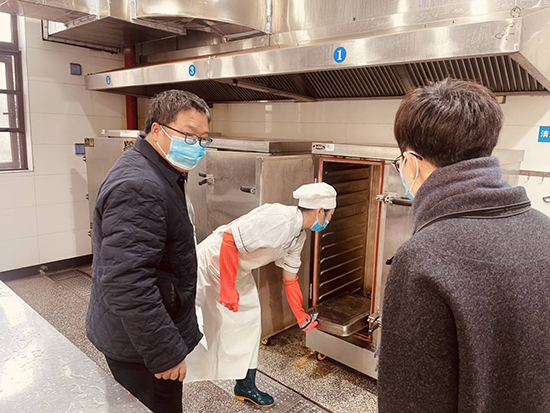 隨后,孫文明來到校長室,與校長趙娜就校園餐管理工作進行深入交流。趙娜匯報了當日食堂巡查情況,并與孫文明共同填寫督導檢查用表。雙方隨即前往學校食堂,對照信息公示、人員管理、設施設備、采購貯存、制作留樣、環境衛生六大督查要點開展實地檢查。督查發現,食堂各項工作均嚴格落實規范要求:墻面公示內容齊全、張貼有序;工作人員著裝統一、全程佩戴口罩;功能分區科學合理,各類工具按色標分類存放;留樣冰箱嚴格執行“雙人雙鎖”制度,食品留樣規范到位;食材貯存做到離地離墻、分類擺放,標識清晰明確。檢查時,食堂工作人員正開展餐后清掃沖洗工作,地面存在潮濕情況,督查人員當即提醒,務必及時做好地面干燥處理,防范人員滑倒風險。