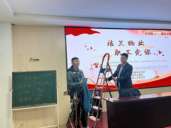 培訓現場,昌碩成校的講師團隊圍繞“物業履約考核標準”展開深度解讀——從履約細則到考核指標,結合《小區空房巡查情況匯總表》等實際工作表單,拆解日常服務中的規范要點,幫助員工明確崗位履職的核心要求。而在應急安全培訓環節,講師通過“現場演示+工具實操”的方式,講解高空作業安全帶、繩索等防護裝備的規范使用方法,黑板上清晰羅列的“安全、主繩、輔繩”等操作要點,讓員工直觀掌握了高空作業的安全防護技能。