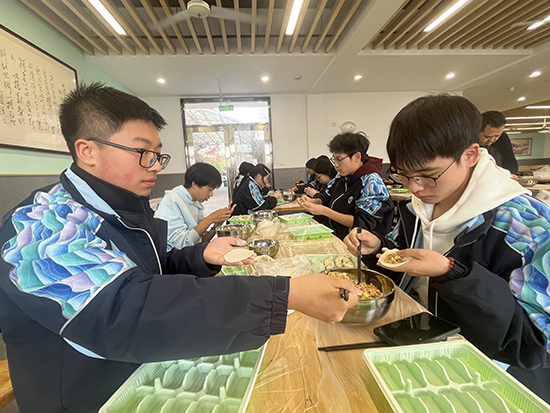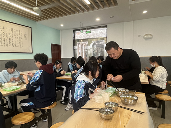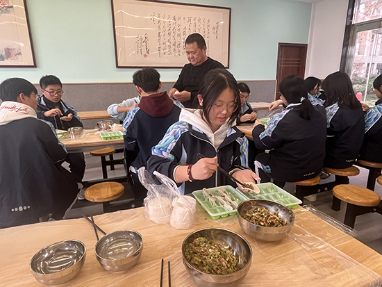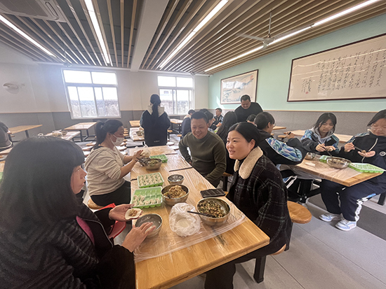 活動(dòng)當(dāng)天,食堂一改往日“單向供餐”的模樣,搖身變成溫馨的“家庭廚房”。有的家長(zhǎng)手法嫻熟,搟出的餃子皮薄如紙、圓如月。有的學(xué)生第一次包餃子,雖然包得歪歪扭扭,卻滿臉自豪。老師們也不甘示弱,一邊包一邊打趣:“這褶子捏得,比我寫教案還認(rèn)真!”