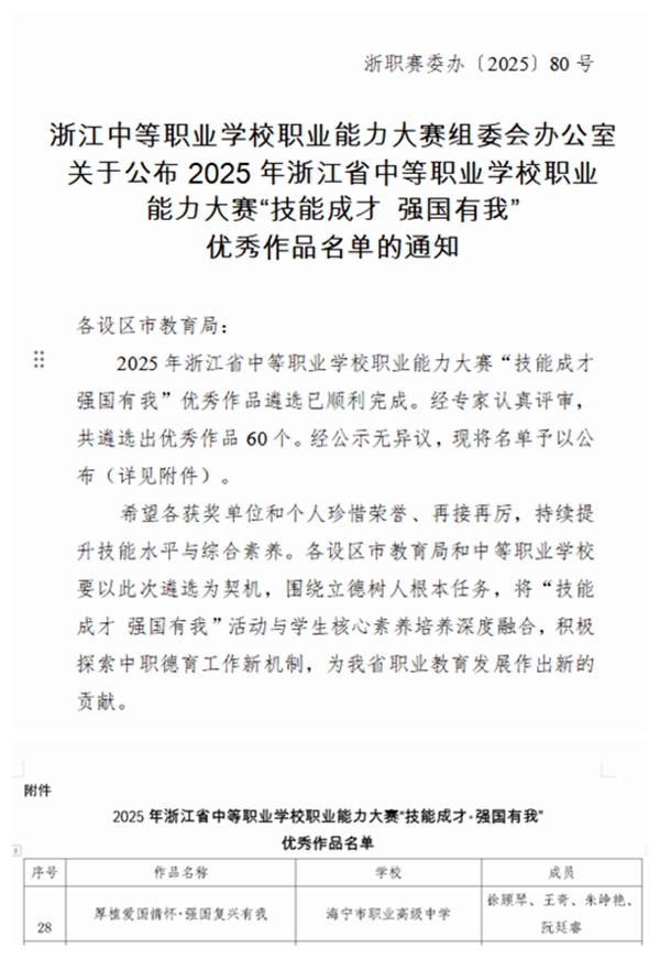 日前,2025年浙江省中等職業(yè)學(xué)校職業(yè)能力大賽“技能成才 強(qiáng)國(guó)有我”優(yōu)秀作品遴選結(jié)果揭曉。經(jīng)評(píng)審,海寧市職業(yè)高級(jí)中學(xué)徐顧琴、王奇、朱崢艷、阮廷睿老師撰寫的《厚植愛國(guó)情懷 強(qiáng)國(guó)復(fù)興有我》脫穎而出,成功入選省級(jí)優(yōu)秀作品名單,充分展現(xiàn)了海職高在愛國(guó)主義教育的探索實(shí)踐成果。
