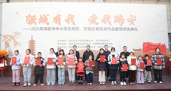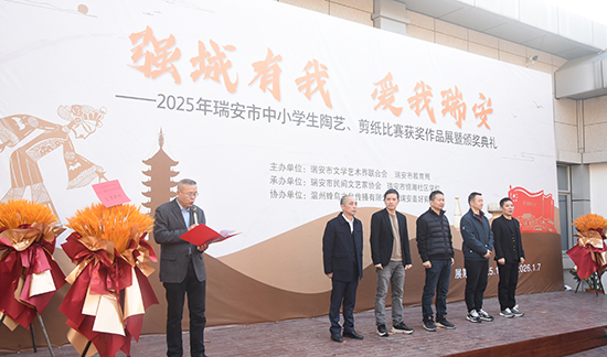 12月27日上午,瑞安市中小學(xué)生陶藝、剪紙大賽獲獎(jiǎng)作品展在瑞安書畫院隆重開幕。瑞安市文聯(lián)黨組成員、副主席楊圣樹,市教育局學(xué)生科科長(zhǎng)蔡海東,市文聯(lián)秘書長(zhǎng)、辦公室主任虞冠偉,市民間文藝家協(xié)會(huì)副主席胡建,錦湖社區(qū)學(xué)校常務(wù)副校長(zhǎng)、市民協(xié)副主席張?jiān)僖娴燃钨e出席活動(dòng)。獲獎(jiǎng)學(xué)生、指導(dǎo)老師及家長(zhǎng)代表共同參與了這場(chǎng)藝術(shù)盛會(huì)。開幕式由瑞安市民間文藝家協(xié)會(huì)主席林良爽主持。