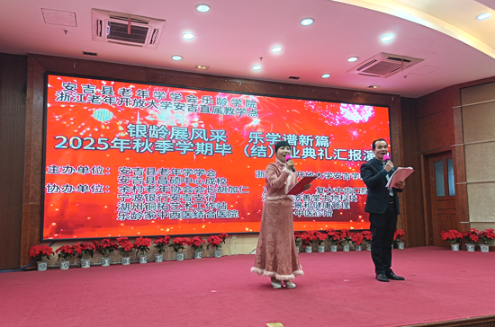 冬日暖意濃,銀齡綻芳華。12月28日下午,由安吉縣昌碩中心成校聯(lián)合安吉縣老年學(xué)會(huì)樂(lè)齡學(xué)院(浙江老年開(kāi)放大學(xué)安吉直屬教學(xué)點(diǎn))主辦的2025年秋季學(xué)期老年班畢(結(jié))業(yè)典禮匯報(bào)演出在百匯大酒店七樓隆重舉行。余村老年協(xié)會(huì)、寧波銀行安吉支行等多家單位協(xié)辦此次活動(dòng),老年學(xué)員們齊聚一堂,用精彩的表演為秋季學(xué)期畫上圓滿句號(hào)。