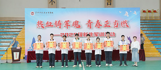 校領導依次為軍訓會操比武優勝班級、軍訓活動先進班級頒發獎狀。