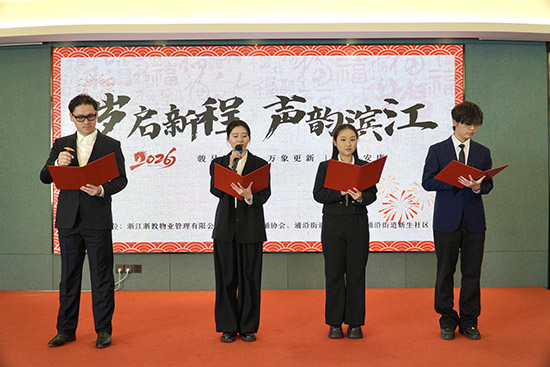 冬陽暖照,辭舊迎新,新年的腳步悄然臨近。2025年12月26日,由浙江浙教物業管理有限公司、濱江區朗誦協會、濱江區浦沿街道濱文社區及新生社區聯合主辦的“歲啟新程聲韻濱江”新年朗誦音樂會溫情啟幕。近50名來自主辦單位的代表和浙江機電職業技術大學、浙江商業職業技術學院、浙江藝術職業學院的師生們,以朗誦、歌唱、樂曲演奏等多元藝術形式,以聲傳情、以樂暖心,共同迎接新年到來。