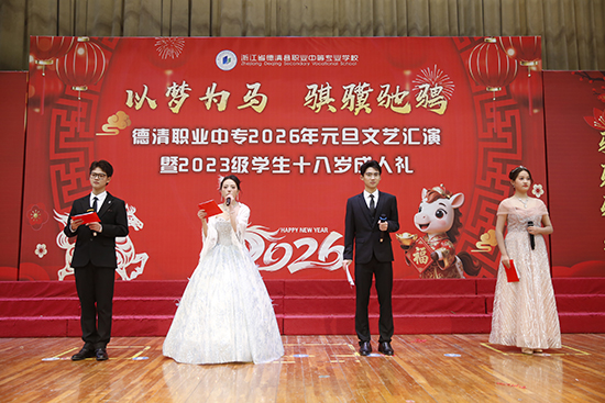 12月31日,德清職業(yè)中專全校師生、家長(zhǎng)代表與嘉賓們齊聚體藝館,共同見(jiàn)證了“以夢(mèng)為馬 騏驥馳騁”2026年元旦文藝匯演暨2023級(jí)學(xué)生十八歲成人禮,迎接新年的到來(lái)。