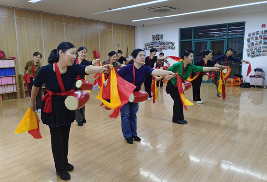 另一邊的腰鼓班則是一派熱鬧歡騰的景象。鼓槌起落,紅綢翻飛,學(xué)員們身著統(tǒng)一服裝,踏著整齊的步伐,敲出鏗鏘有力的節(jié)奏。腰鼓講究“身隨鼓動,鼓隨人鳴”,從基本的鼓點節(jié)拍,到復(fù)雜的隊形變換,老人們頂著烈日反復(fù)練習(xí),汗水浸濕了衣衫,卻澆不滅心中的熱情。結(jié)業(yè)展演中,激昂的鼓點響徹社區(qū),豪邁的姿態(tài)盡顯活力,展現(xiàn)出新時代老年人昂揚向上的精神風(fēng)貌。
