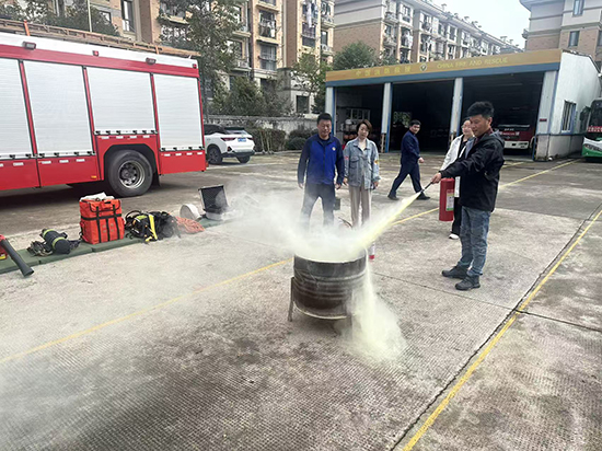 理論學習后,實操演練環節有序開展。丁隊長現場演示了滅火器“提、拔、握、壓”四字操作訣、消防栓水帶連接等關鍵技能,強調“上風向站位”“對準火焰根部噴射”等實操細節 。全體教職工分組參與實戰練習,在專業指導下親身體驗滅火器使用、應急疏散等實操項目,通過“手把手”教學確保每位教職工都能熟練掌握應急處置技能,真正做到“人人懂操作、個個能應急”。