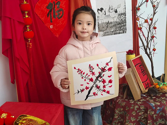 活動中,老師們以清末海派名家吳昌碩的經典畫作《紅梅圖》為摹本,帶領幼兒細致觀察紅梅的形態、色彩與神韻,引導孩子們感悟梅花迎寒綻放的堅韌品格。孩子們認真賞析畫作,隨后自主開展梅花繪畫創作。在點、畫、涂的過程中,幼兒的手部精細動作得到充分鍛煉;在經典畫作的藝術熏陶下,孩子們不僅領略到傳統水墨藝術的雅致韻味,更深入理解了小寒賞梅的節氣習俗。