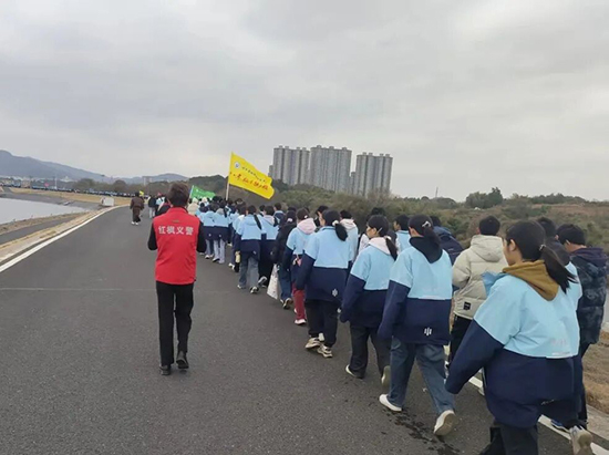隨著活動開始,學生們在班主任與任課老師的帶領下,身著統一校服,手舉鮮艷班旗,以兩路縱隊的整齊隊形有序出發。六公里的江堤路程,沿途風光旖旎,師生們歡聲笑語相伴,并肩前行。大家互相鼓勁加油,在欣賞美景的同時釋放身心,用腳步丈量大地,將對新年的期許融入每一步征程。