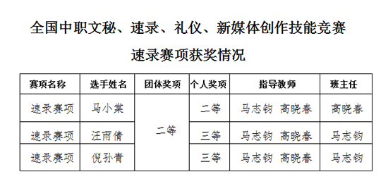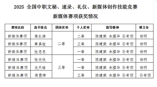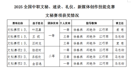 喜訊傳來(lái),捷報(bào)飛至!為期三天的2025全國(guó)中職文秘、速錄、禮儀、新媒體創(chuàng)作技能競(jìng)賽在浙江省桐鄉(xiāng)市衛(wèi)生學(xué)校圓滿收官。杭州市富陽(yáng)區(qū)職業(yè)教育中心學(xué)子憑借扎實(shí)的專業(yè)功底、出色的臨場(chǎng)發(fā)揮和卓越的綜合素養(yǎng),一路披荊斬棘,在全國(guó)300多名選手,16個(gè)團(tuán)體及個(gè)人比賽中,一舉斬獲9金7銀8銅的好成績(jī),用實(shí)力書(shū)寫(xiě)了中職生的技能榮光。謹(jǐn)此,向所有獲獎(jiǎng)同學(xué)表示最熱烈的祝賀!向辛勤指導(dǎo)的老師們致以最崇高的敬意!向關(guān)心支持此項(xiàng)競(jìng)賽的領(lǐng)導(dǎo)們表示最誠(chéng)摯的感謝!
