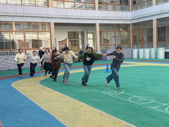 賽場之上,萌娃們活力四射;賽場之外,教師們也不甘示弱。一場緊張有趣的“滾雪球”比賽精彩上演,三個年段的教師各組成十人小組,哨聲一響,首位教師飛速沖向對面,與同伴手拉手后共同折返,隊伍如滾雪球般不斷壯大。賽道上,教師們的身影矯健颯爽,這場比賽不僅是速度的較量,更是團隊默契的考驗。大家紛紛表示,輸贏并非目的,在協作中收獲的快樂才最為珍貴。