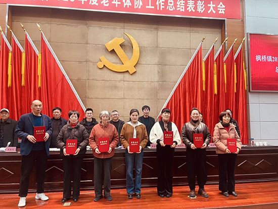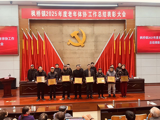 會上,楓橋鎮老年體協副主席王湯渭宣讀了楓老協[2026]1號表彰文件。霞朗橋村等13個村(社團)獲評鎮老年體協年度先進集體,楊仲木、陳培良等19位同志獲評年度先進個人。值得一提的是,楓橋鎮老年體協憑借突出表現,再次榮獲諸暨市年度老年體育工作特等獎,并斬獲“浙江省老年體育工作先進單位”榮譽。受表彰代表分五批依次上臺,在熱烈的掌聲中從與會領導手中接過獎牌,臉上洋溢著自豪與喜悅。