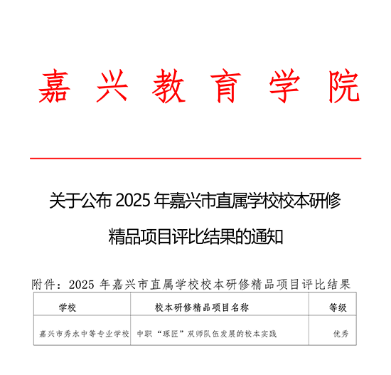 近日,2025年嘉興市直屬學校校本研修精品項目評比結果公布,嘉興市秀水中等專業學校申報的《中職“琢匠”雙師隊伍發展的校本實踐》獲得優秀。這一榮譽背后,是學校堅持“精技善教、匠師合一”核心理念,深耕師資培養的扎實實踐。