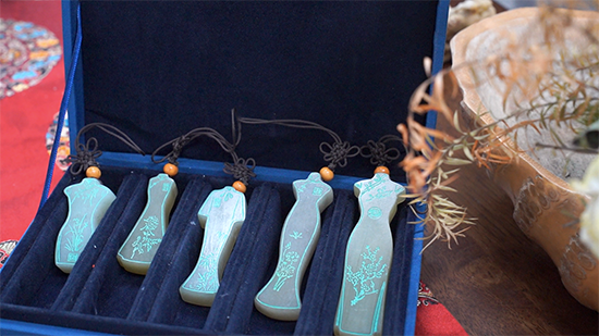 無數次深夜研討、反復打磨設計方案,張西琴的時尚視野與董利民的非遺功底形成完美互補。他們摒棄簡單的元素疊加,轉而追求文化精神的深度契合,最終確定以“五韻·五和”為核心主題,將梅、蘭、竹、菊、荷五種花木雅韻與采荷“和樂、和善、和美、和睦、和順”的“五和”理念一一對應,通過金石篆刻的藝術形式呈現在旗袍之上,讓每一件作品都成為可穿戴的文化載體。