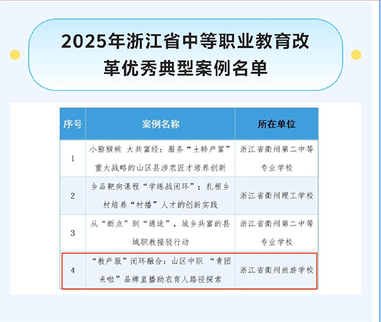 此次獲獎,既是對學校改革實踐的充分肯定,更是對未來發展的激勵與指引。學校將持續發揮典型案例的示范作用,推廣可復制、可借鑒的經驗成果,進一步深化教育教學改革,為助力共同富裕與區域高質量發展貢獻更多職教力量。(樓芳玲)
