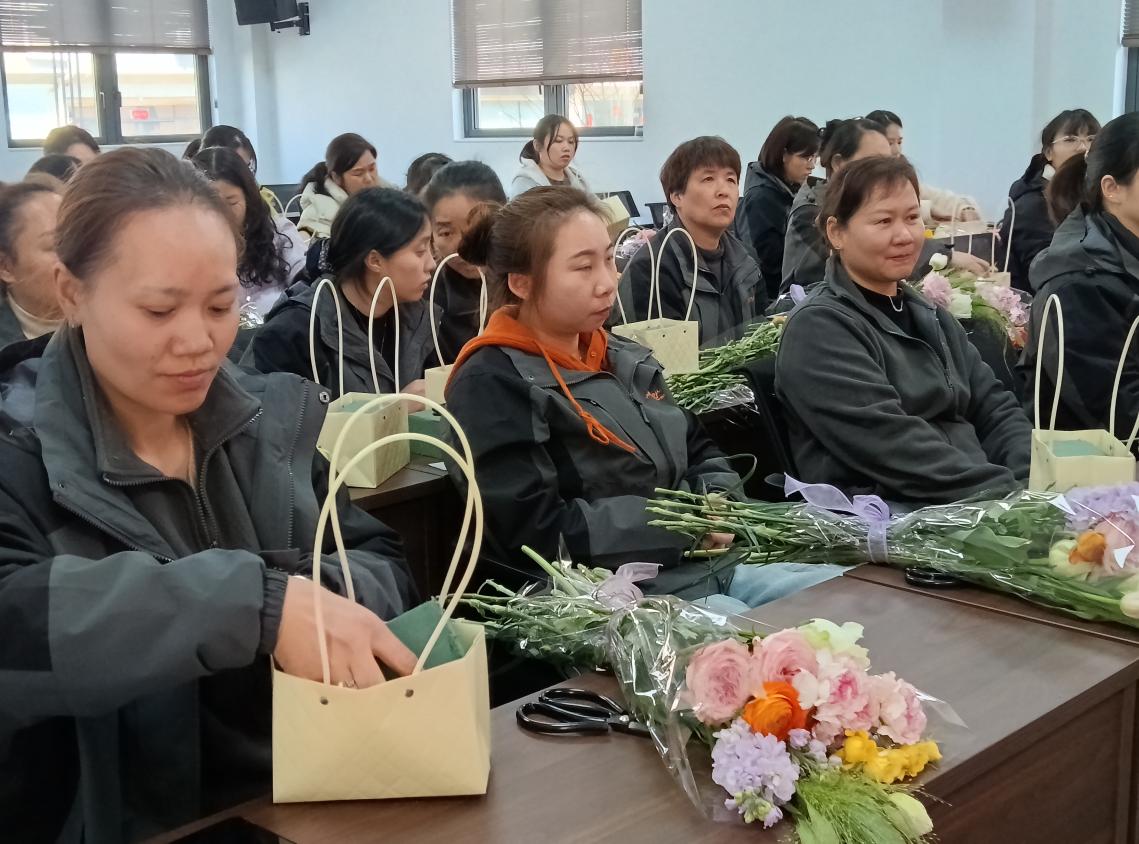 隨后,插花教學正式開始。特邀花藝老師結合春日生機與審美需求,為大家細致講解插花技巧,從花材的識別、修剪方法,到色彩搭配、造型設計,再到手提袋花器的巧用,老師深入淺出、示范到位,將實用技巧與審美理念融入每一個細節,讓在場女性快速掌握插花要領。“插花不僅是一門手藝,更是一種生活態度,用心搭配每一枝花,就能收獲一份美好與喜悅。”老師的生動講解,讓大家在學習花藝的同時,更懂得感受生活之美、珍惜幸福時光。