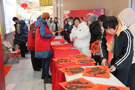 2月7日,系列活動的首站在人流如織的平湖吾悅廣場溫暖啟幕。在商場濃厚的迎新春氛圍中,學院書法班的師生們擺開書案,現場揮毫,為往來市民免費書寫并贈送“福”字與春聯。他們以嫻熟的書法技藝,將人們對丙午馬年的憧憬與對美好生活的向往,凝注于一筆一劃之中。求“福”字、選春聯的市民絡繹不絕,將書寫臺圍得水泄不通。紅紙黑字,翰墨馨香,為繁華的商業中心注入了一份典雅而溫暖的傳統年味。師生們公益奉獻的熱情和精湛的書法技藝,贏得了市民們的連連稱贊,讓中華傳統文化的魅力在“煙火人間”生動綻放。