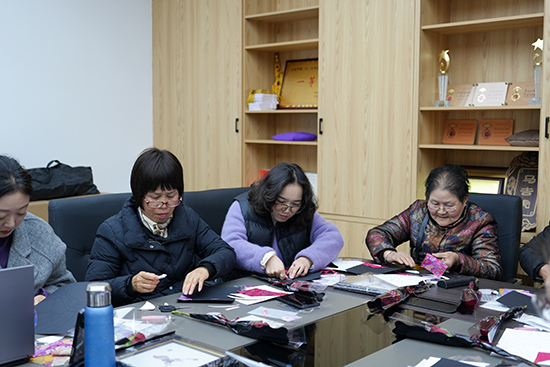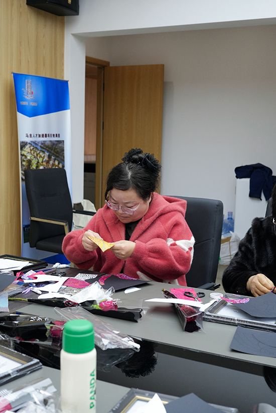 活動伊始,宋錦技藝傳承人、安吉自然竹義基地宋美萍女士以生動的講解,帶領大家走進宋錦的世界:從南宋宮廷御用貢品,到如今的國家級非遺,宋錦“經緯交織、花中套花”的復雜工藝,以及兼具實用與美學的特點,讓在場的婦女同胞們嘖嘖稱奇。隨后的實操環節,大家在老師的耐心指導下,小心翼翼地將裁剪成生肖馬紋樣的宋錦布料,與瑩潤的珍珠搭配拼貼,再用膠水固定裝裱。原本普通的布料與珍珠,在一雙雙巧手下變成了寓意吉祥的藝術作品。