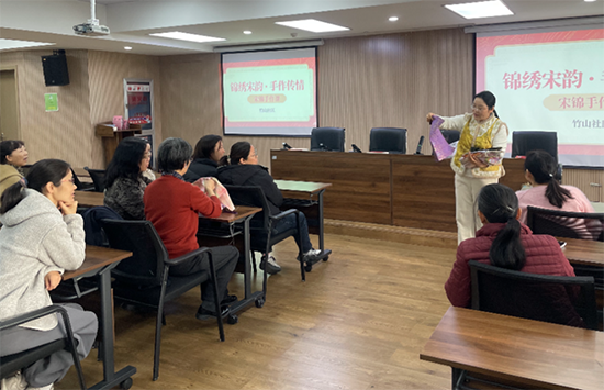 課堂之上,老師一邊講解宋錦的歷史淵源與工藝特點(diǎn),一邊引導(dǎo)居民觸摸宋錦的經(jīng)緯紋路,大家直觀感受著傳統(tǒng)紡織工藝的精湛與厚重,沉浸式體會(huì)非遺文化的獨(dú)特魅力。