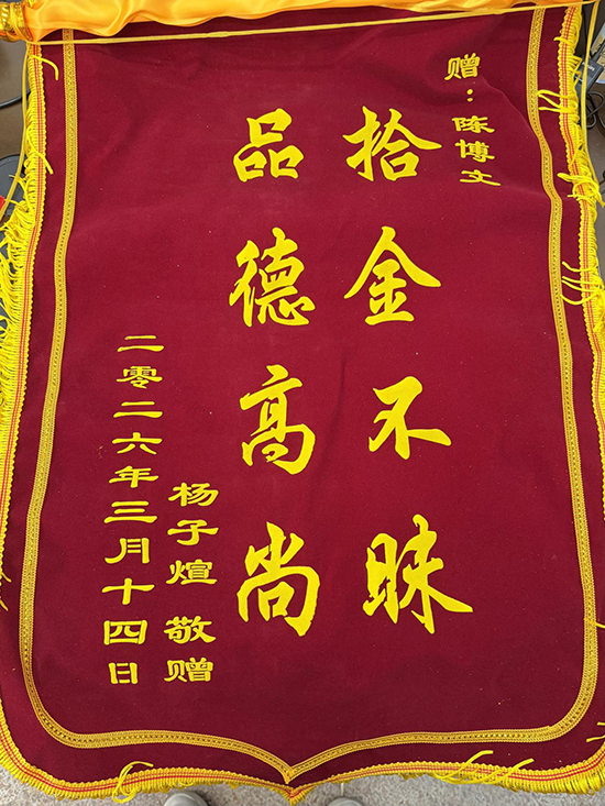 近兩個小時后,楊先生急匆匆趕到。看到對方焦急的神情和鬢角的白發,陳博文深知這筆錢對普通家庭意味著什么。楊先生道謝后執意要給“感謝費”,被陳博文當場婉拒:“我做這些事,不是為了物質上的嘉獎。”幾天后,楊先生專程送來錦旗,這份精神的肯定成為了陳博文心中最珍貴的勛章。