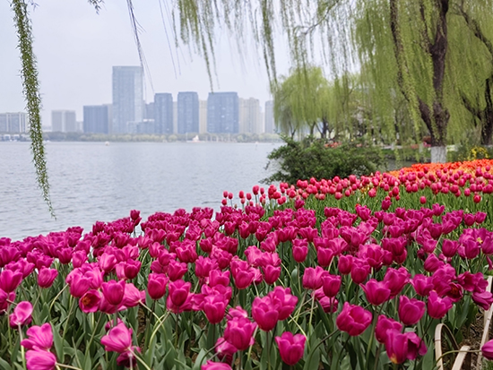 上午,老師們乘坐游船緩緩駛入瓜渚湖。湖面波光瀲滟,兩岸的郁金香正值盛花期,紅、粉、黃、紫等各色花朵層層錯落,宛如一幅詩意畫卷。大家漫步于花叢之間,時而駐足細細嗅聞花香,時而舉起手機記錄美麗景致,歡聲笑語在湖畔久久回蕩。