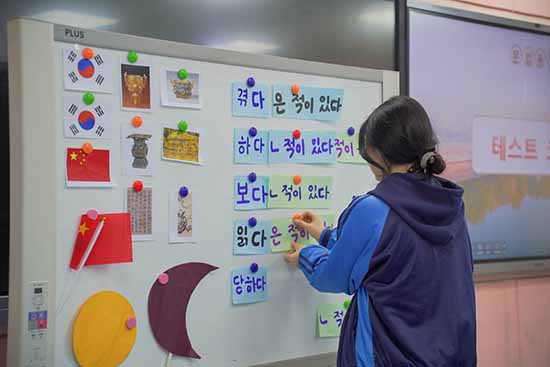 秀水中專沈業詩老師帶來韓語公開課《紫禁城、頤和園和天壇——?/?????》。沈老師以“文物講述”為主線,運用AI形象導入語法知識,借助VR全景軟件創設沉浸式文化場景,引導學生通過小組合作完成文物劇本創作與演繹,在情境中活用語法講述中國文物故事,實現了語言學習與文化傳承的有機融合。