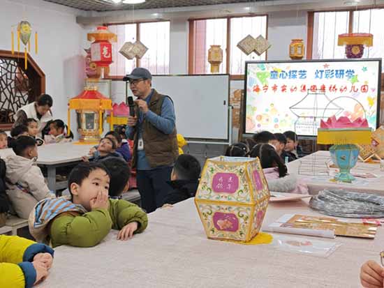 3月16日,海寧市實幼集團康橋幼兒園的135名師生率先走進海職高。在燈彩實訓室內,孩子們在非遺傳承人壽斌杰的引導下,好奇地觀察著一盞盞精美的硤石燈彩作品,聆聽關于針刺、拗彩、繪畫等傳統工藝的講解,眼中閃爍著對非遺文化的向往。