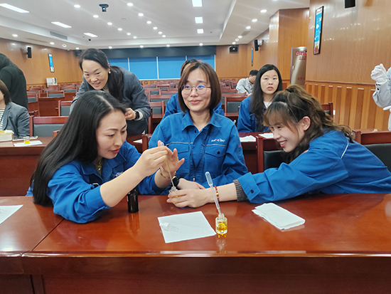 活動現(xiàn)場,專業(yè)講師圍繞水油雙相精華液原理、植萃原料護膚功效及不同膚質(zhì)適配技巧進行細致講解,幫助職工深入了解天然護膚知識,以健康之美呼應“最美杭州”的城市風貌,讓文明理念在日常服務中潤物無聲。在實操環(huán)節(jié),職工們在講師指導下,根據(jù)自身膚質(zhì)需求,精準調(diào)配桂花純露、分餾椰子油、薰衣草精油等天然原料,親手完成專屬精華液的制作,在沉浸式手作中放松身心、舒緩壓力,以指尖匠心傳遞“桂在你我”的鄰里溫情,讓跨企業(yè)職工在互動中凝聚共識、增進聯(lián)結,恰似桂花一篷篷一簇簇綻放,彰顯團結與共建的力量。
