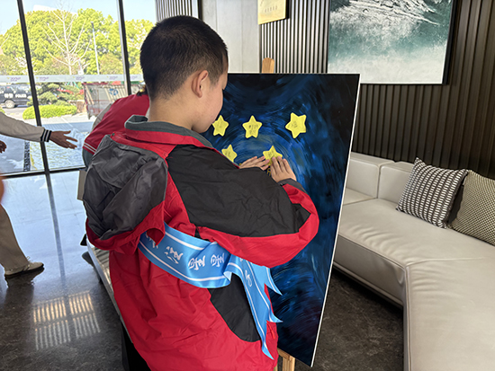 活動現場,志愿者陪伴孤獨癥小朋友在小區大廳設立了暖心宣傳點。在志愿者的耐心引導下,孩子們化身小小關愛宣傳員,主動為來往居民送上印有孤獨癥關愛標語的定制紙巾,將科普知識融入日常小物件,貼心又接地氣。緊接著,小朋友們還與志愿者一起,為居民系上象征關愛與包容的藍絲帶,輕盈的絲帶系在腕間隨風飄動,既表達了對孤獨癥群體的支持,也把包容與善意傳遞給了每一位鄰里。