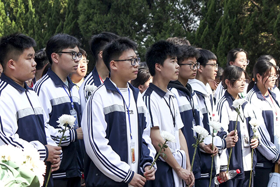 教師代表和學生代表向烈士紀念碑敬獻鮮花。隨后,全體師生向烈士們深深地鞠了三個躬,默哀一分鐘,表達對革命先輩們的敬仰與緬懷之情。