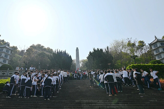 清晨,學校黨員教師、團員教師和高一年級學生1500余人懷著對革命先烈無比的敬意與無限的哀思,昂首闊步走向東山烈士陵園。黨旗、團旗和校旗迎風飄搖,他們用自己的腳步丈量曾經先烈們的紅色足跡,用自己的毅力體驗曾經先烈們的堅韌不拔,體會今天的盛世繁華來之不易。