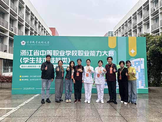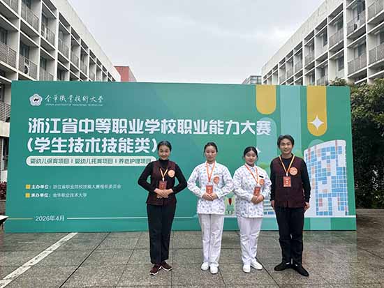 2026年4月2至3日,浙江省中等職業學校職業能力大賽(學生技術技能類)“養老護理”項目比賽在金華職業技術大學舉行。來自省內各中等職業學校護理專業的15支隊伍參與比賽。海寧衛生學校(海寧市綜合高級中學)參賽選手章宋穎、王奧威、王韻格、段玉婷,憑借新穎的項目設計、精湛的操作技能、出色的團隊合作精神和靈活的應變溝通能力獲得一等獎(第一名),這是學校參加該賽項以來的最好成績,更是我們養老護理人砥礪奮進四年的圓夢時刻!