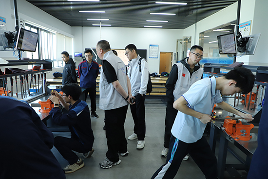 在鄞州職高校長(zhǎng)張武劍的帶領(lǐng)下,朱波一行參觀了校園及四大專業(yè)群實(shí)訓(xùn)場(chǎng)地,實(shí)地考察學(xué)校的教學(xué)環(huán)境與實(shí)訓(xùn)條件。