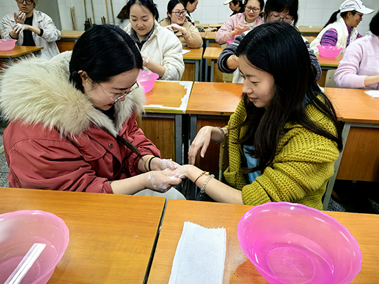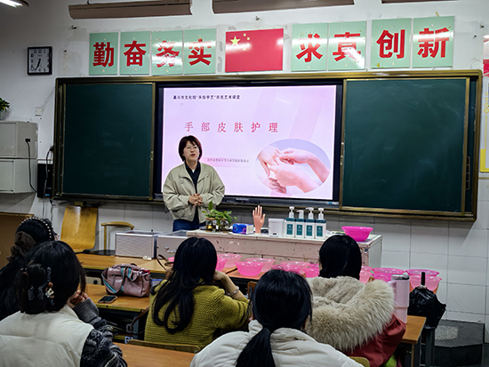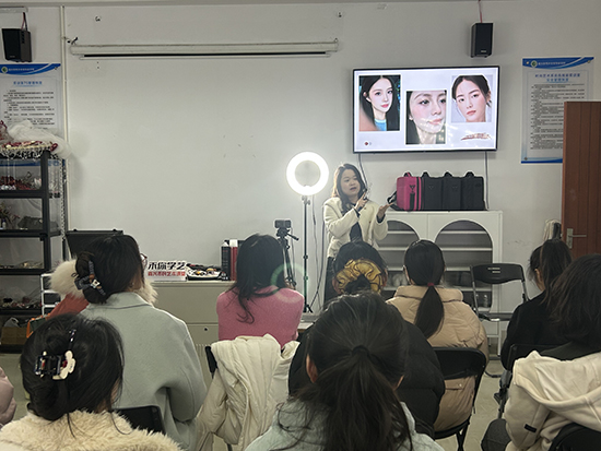 學員們圍坐在專業的美容化妝實訓臺旁,認真聆聽老師講解皮膚類型分析與護膚流程。這里沒有枯燥的理論堆砌,只有“手把手”的親身實踐:從清潔、按摩到面膜護理,每一步都在實訓設備上親手操作。課程不僅涵蓋日常護膚與妝容設計,還融入了職業形象塑造的內容,引導學員重新審視自身的獨特氣質,為未來的職業發展增添自信與底氣。